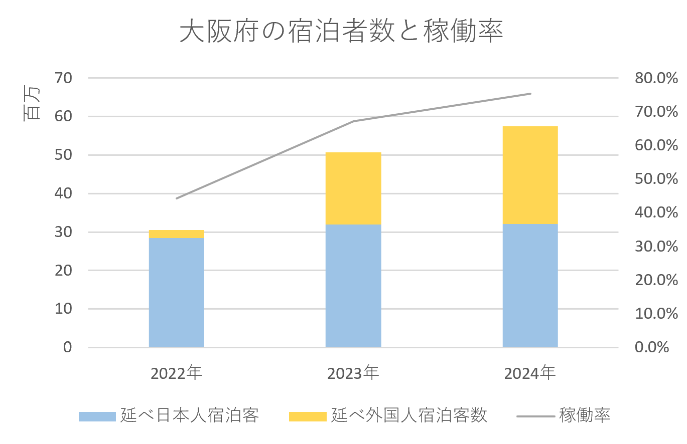 コロナが明けてから旅行客数がコロナ前と同水準まで回復し、インバウンドが増加傾向のなか、大阪の宿泊施設の稼働状況が70~80%と全国でも有数の高いレベルで推移していました。